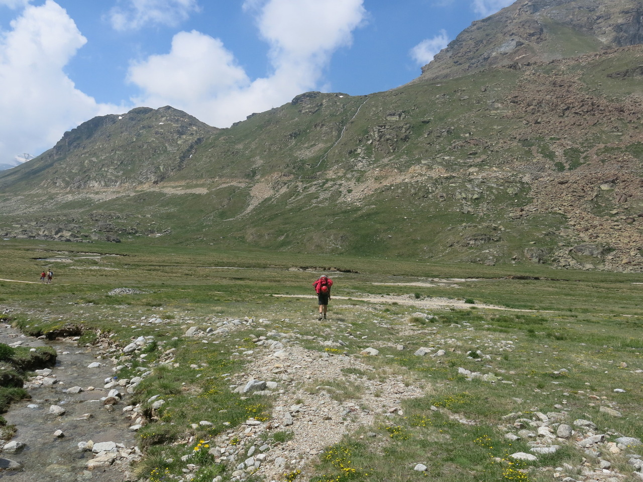 Actually we planned to walk only half a day after the Gran Paradiso. We wanted to sleep at Rif. Citta di Chivasso and we thought arriving at about 2pm on a Tuesday would be sufficient to get two places to sleep without prior reservation. So this assumption was wrong…when we arrived the owner told us that the hut is already completely booked. Up to this point the path was absolutely great. First we climbed up a nice and narrow mountain path from 2000m to about 2800m. There we had a long break. We were able to see the Gran Paradiso from here. From there we walked down 400m and then continued through a very wide and long valley. There we saw many different flowers and lakes all around. When the hut owner told us that the hut is already booked I think we looked quite stupid… We had to walk down to the next hut approx. 1000m below the other one. The path was a long and boring road… For some time the weather has been expected to change to rain and thunderstorm. And when we looked up to the sky it was obvious that it was only a question of hours before the storm will start. So we hurried like idiots down the long road to the next Rifugio. Two hours before the storm we finally arrived… This is still enough time but on the other hand we didn’t know when it is going to start… I guess every friend of mountaineering knows this feeling… In the end we ordered half a liter of wine to finish this day.