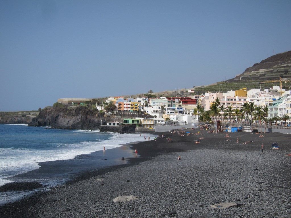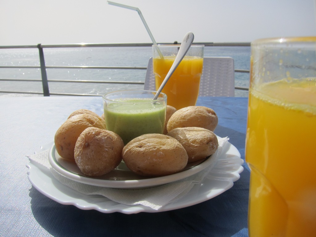 Today we spent most of the time laying in the sun, reading, relaxing! In the afternoon we took the bikes and cycled down to Puerto Naos. We went to a beach bar and enjoyed some patatas arrugadas and fresh orange juice. Puerto Naos offers some souvenir shops and restaurants. There is a big pedestrian area and a huge hotel. Still we decided we like the beach in Tazacorte a lot more 😉
