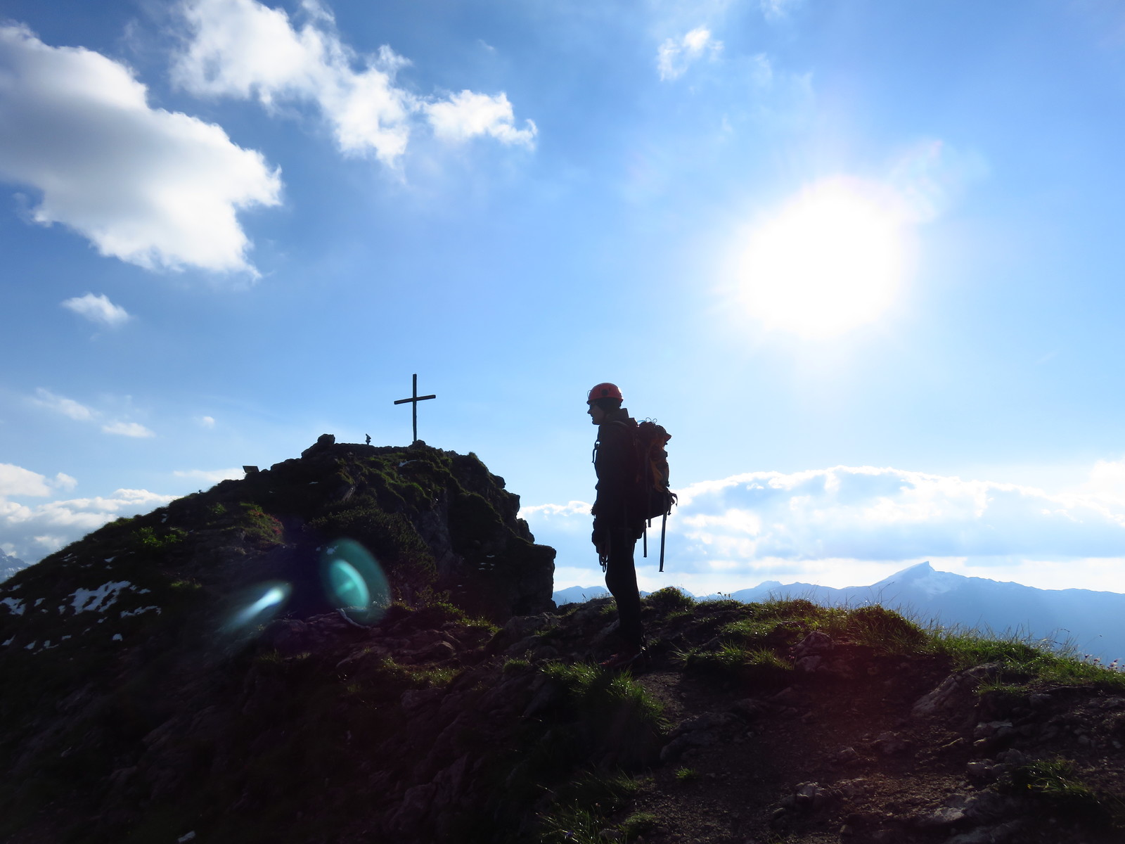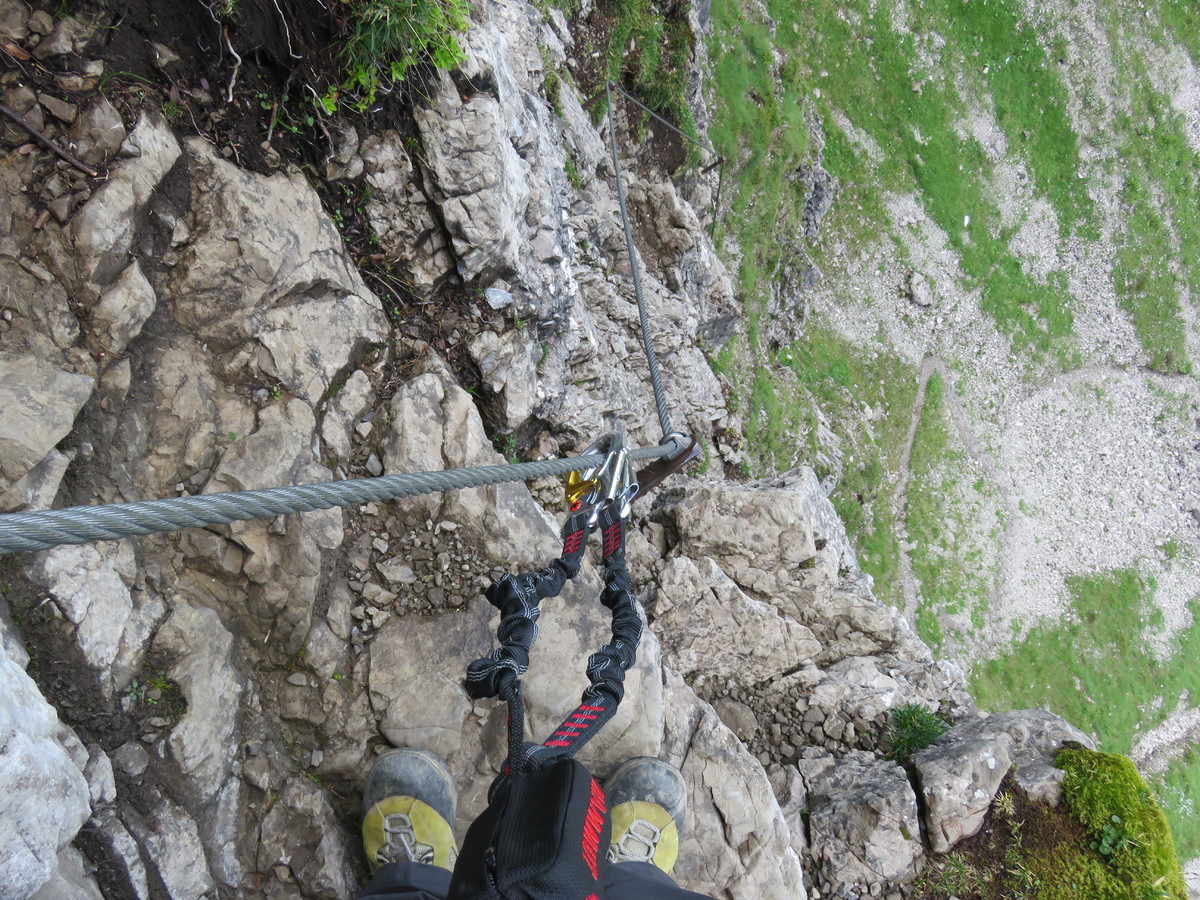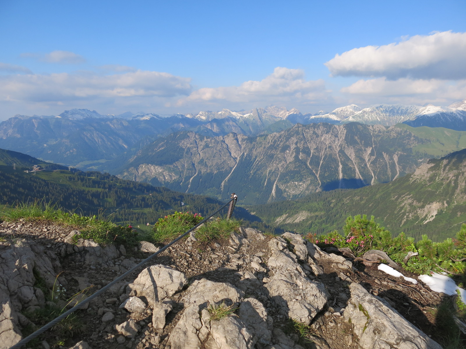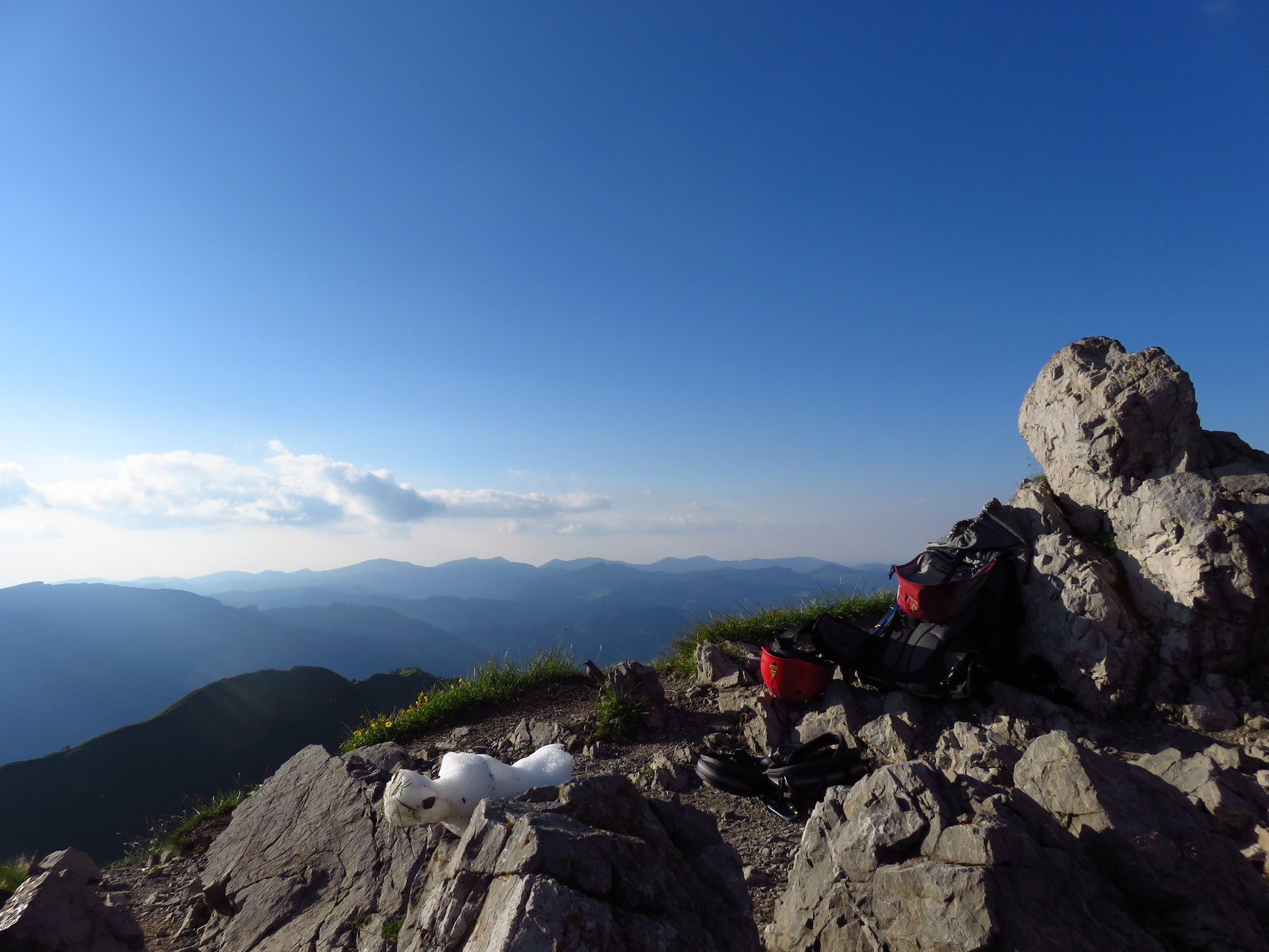 So instead we take the car and drive to Riezlern. After many traffic jams we finally arrived at about 3pm. During the drive we already decided that we will try to do the "Zweiländer Sportklettersteig" on the Kanzelwand. The difficulty is about C/D-D, so this is one of the more difficult ones. We walk up from Riezlern and reach the beginning of the via ferrata at about 5:30 pm. The view is very beautiful, because most mountains are covered in a bit of snow and because it was alredy late we are the only people in the wall! The via ferrata is very exhausting, there are many traverses and often it is hard to find a good place for the feet. But anyway we did it! 🙂 After about one and a half hours we safely arrive on top of the Kanzelwand.