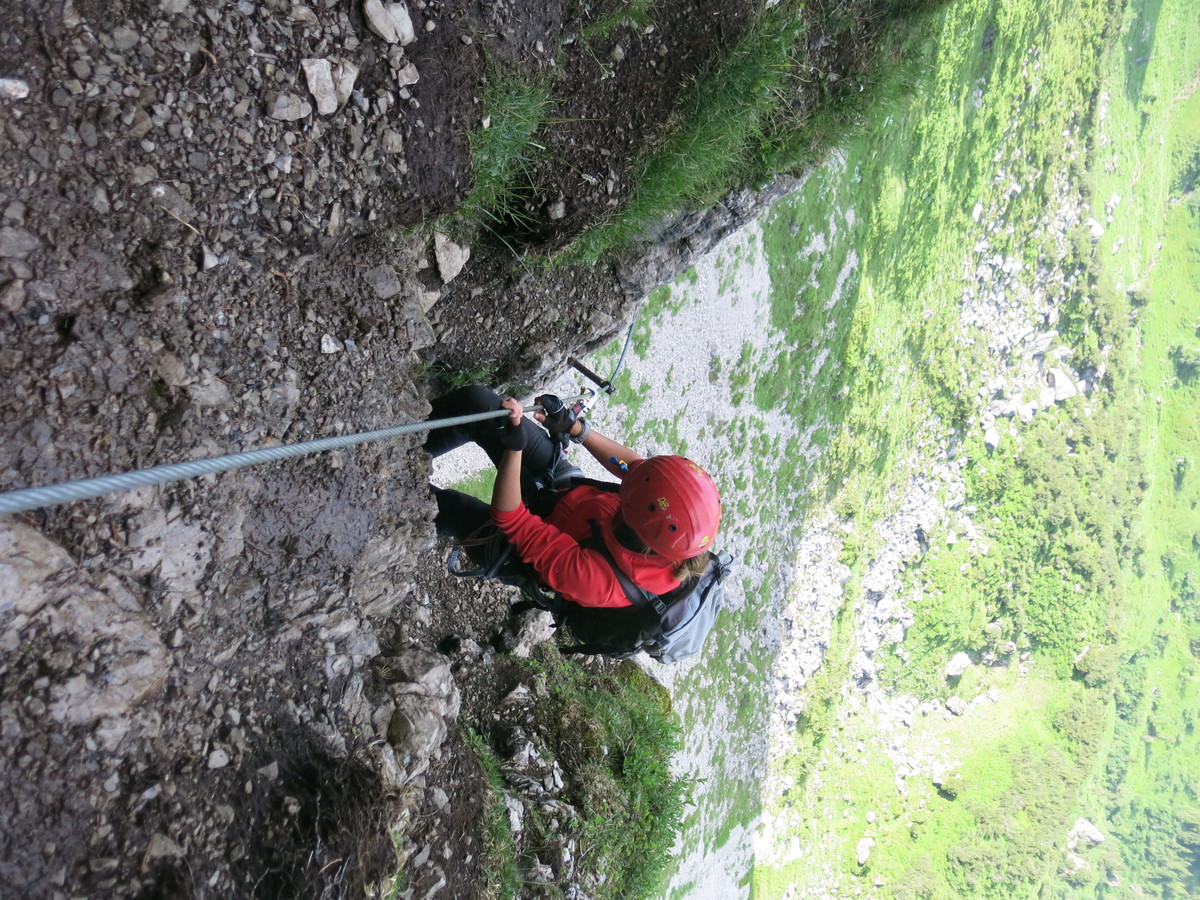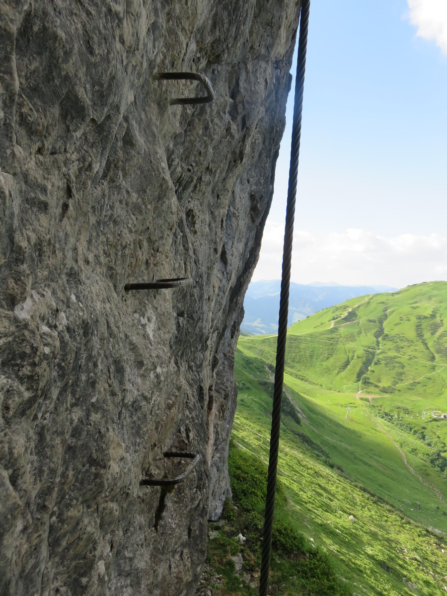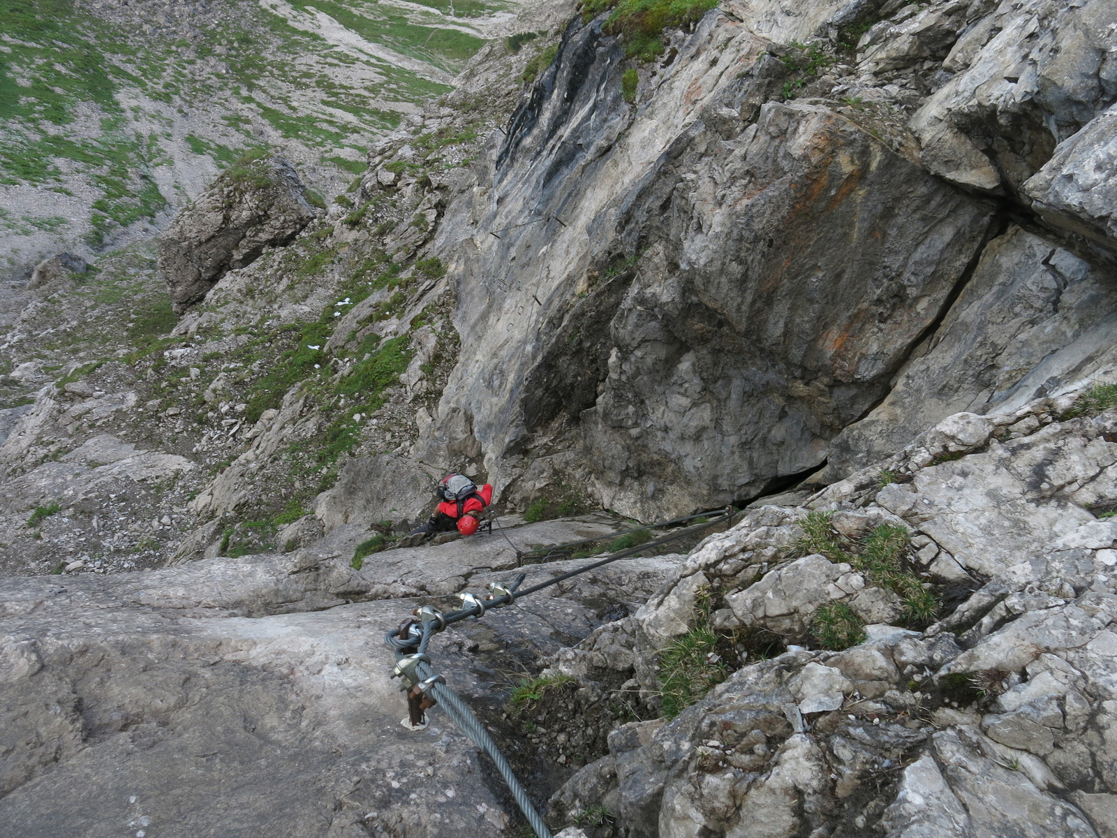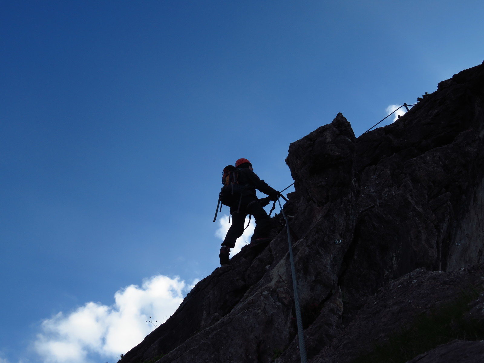 So instead we take the car and drive to Riezlern. After many traffic jams we finally arrived at about 3pm. During the drive we already decided that we will try to do the "Zweiländer Sportklettersteig" on the Kanzelwand. The difficulty is about C/D-D, so this is one of the more difficult ones. We walk up from Riezlern and reach the beginning of the via ferrata at about 5:30 pm. The view is very beautiful, because most mountains are covered in a bit of snow and because it was alredy late we are the only people in the wall! The via ferrata is very exhausting, there are many traverses and often it is hard to find a good place for the feet. But anyway we did it! 🙂 After about one and a half hours we safely arrive on top of the Kanzelwand.