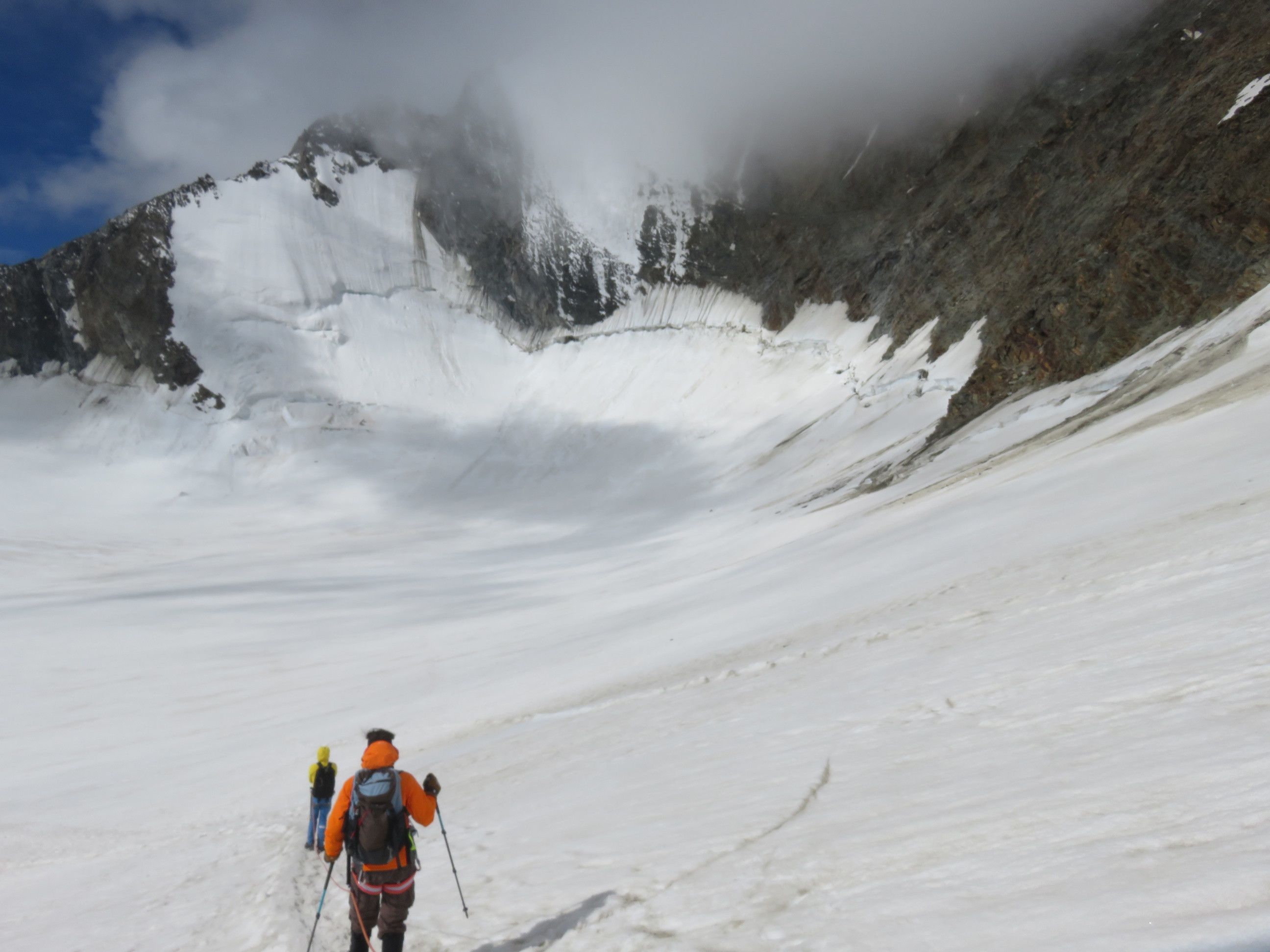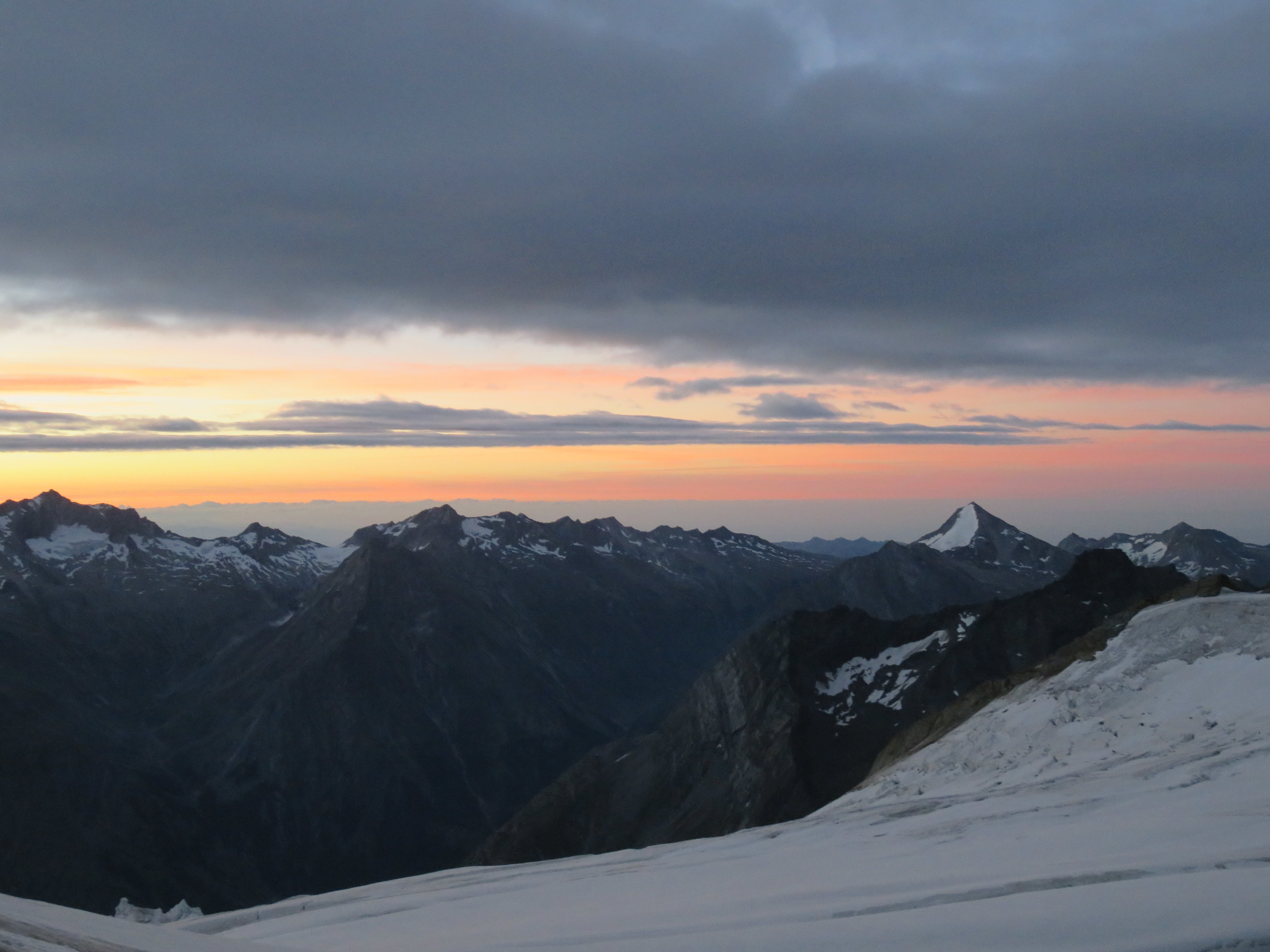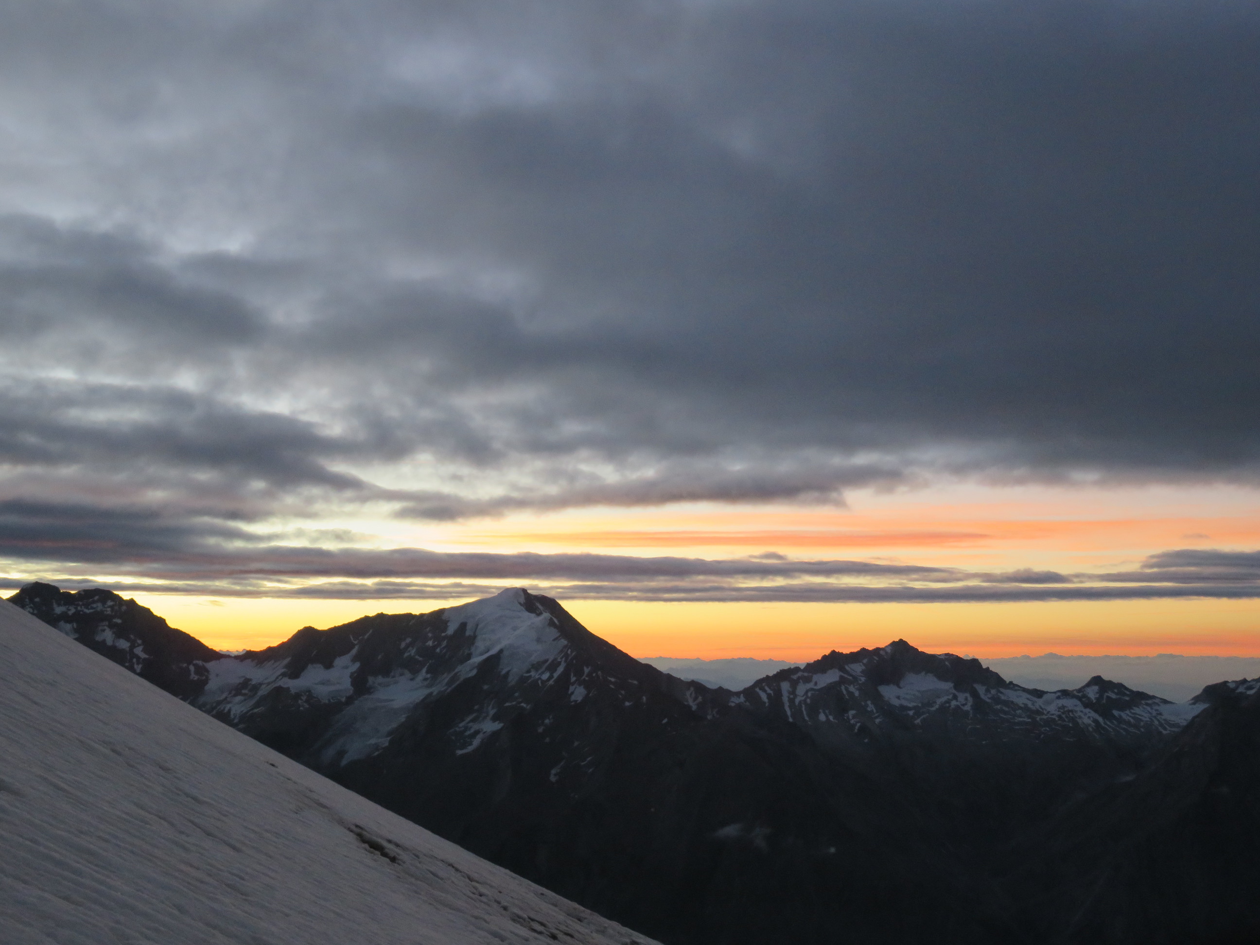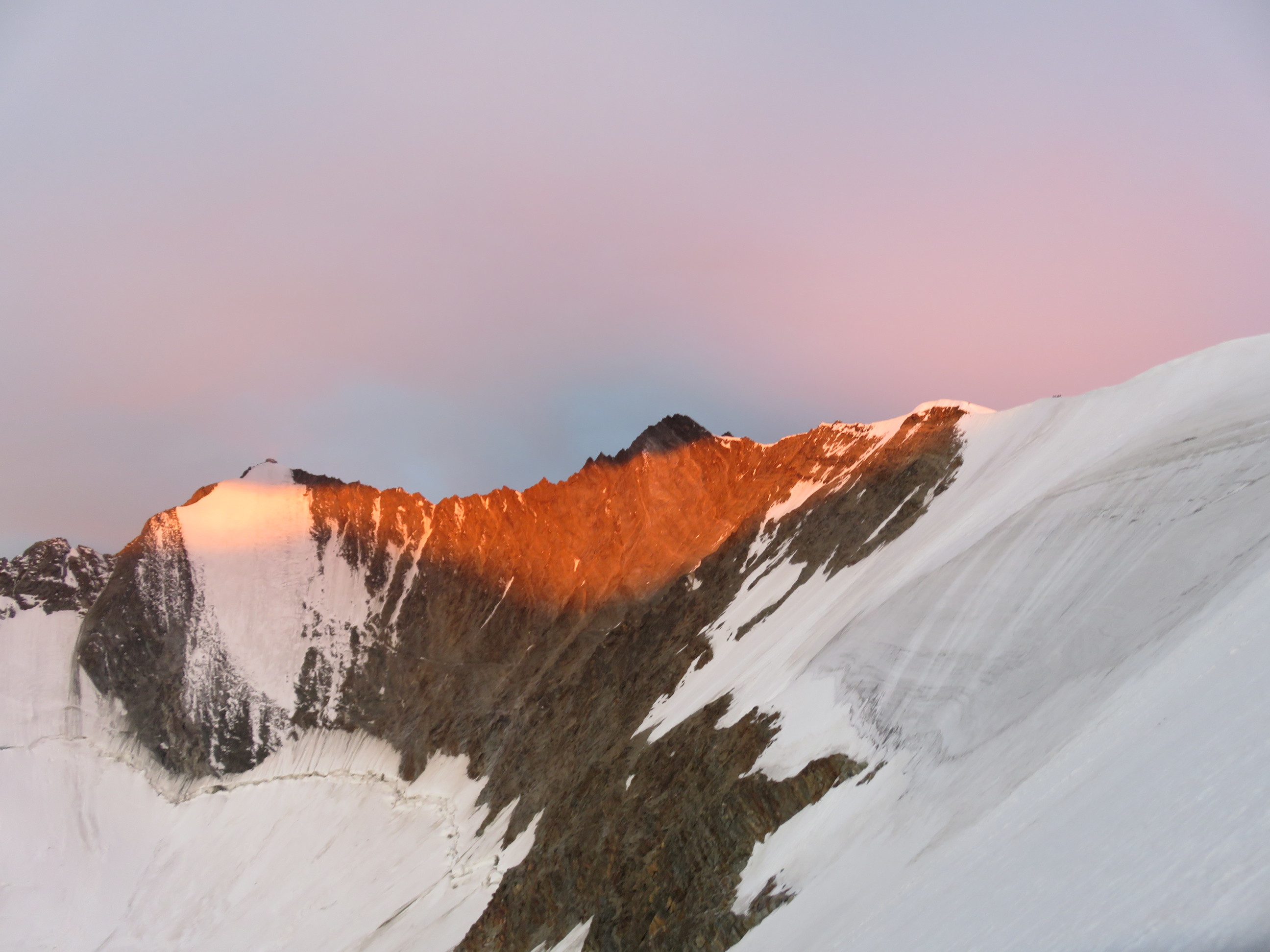 The next morning we started in the darkness and were able to see the colorful sunrise in the morning from the glacier. All the day there was a storm, it was really cold and icy. That made the ascent quite difficult. In the beginning you just have to walk on a glacier, but for the last hour some climbing on the ridge is required. After about 4 hours we reached the summit, unfortunately it was completely covered in a cloud and we could see only a few meters. We stayed only for a couple of minutes before going the same way back down to the Mischabelhütte. When we left the glacier we also left the cloud and walked the rest of the day in sunshine. The way to the summit of the Nadelhorn is really a great tour and would even be better with sunshine 🙂