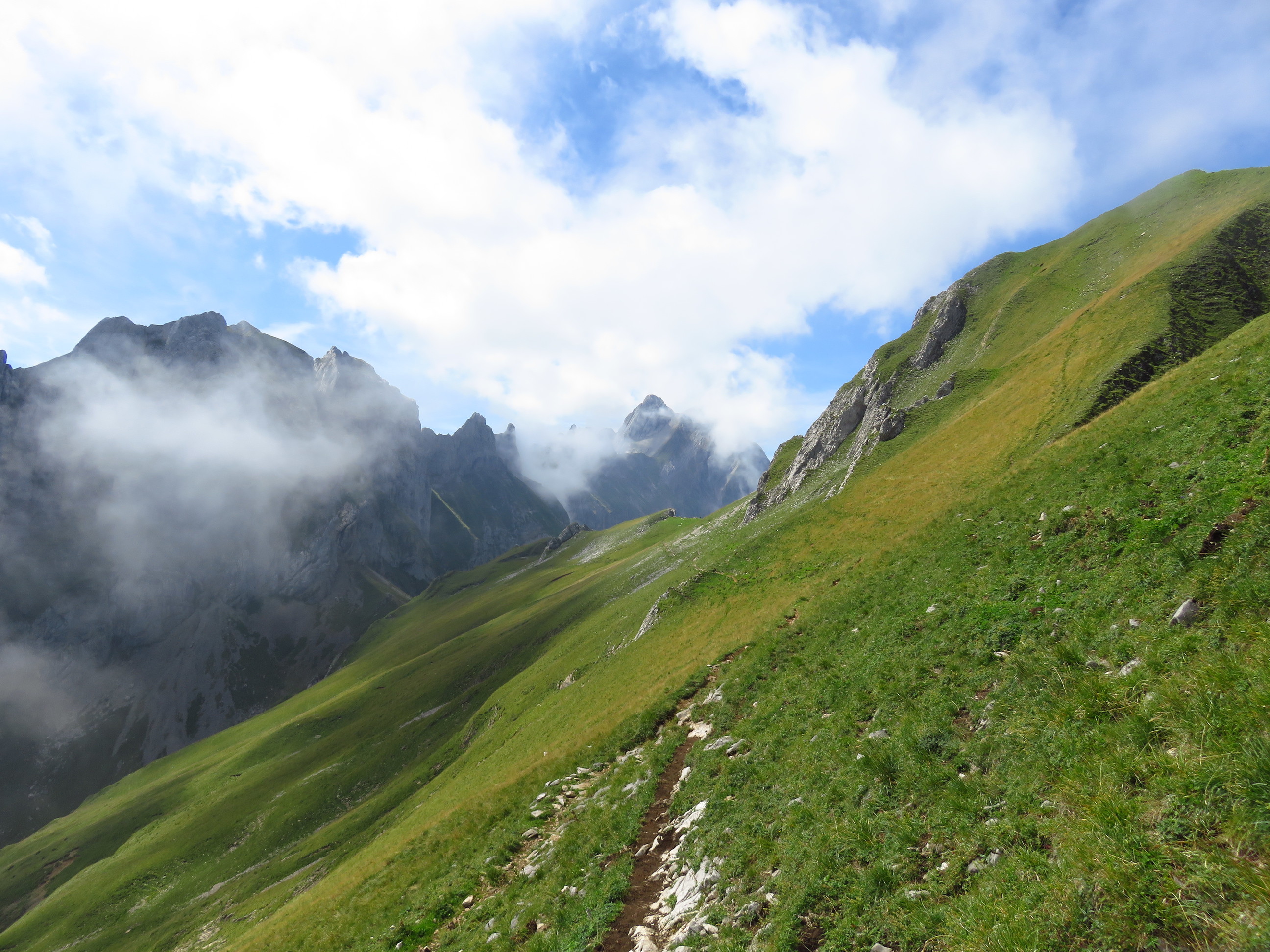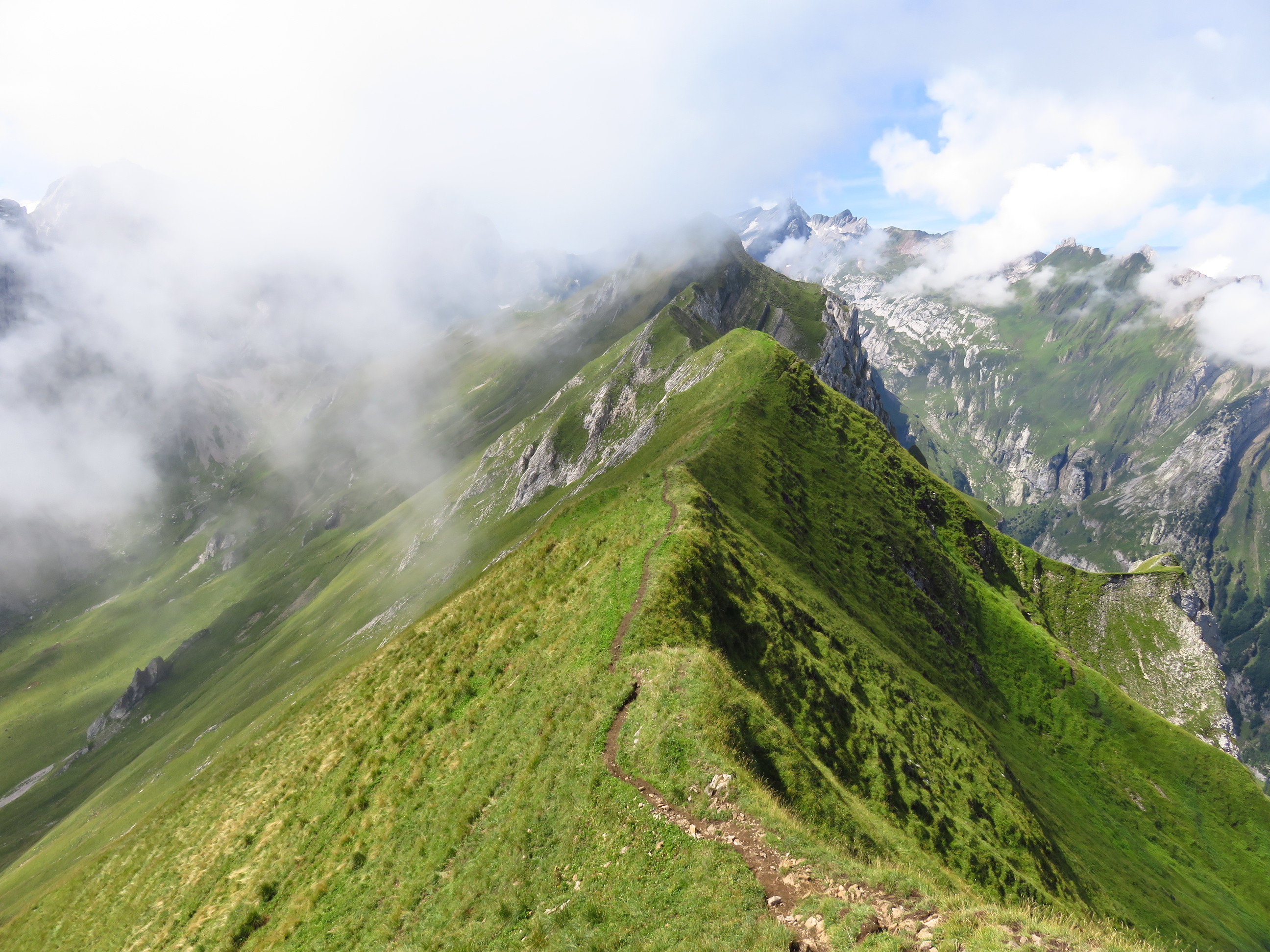 I started in Wasserauen and went up to Bogarten. From there the path becomes smaller and steep and very exposed. You walk on the side of the Marwees and later on the grassy ridge. The view all around is really amazing! I was the only person there during this time and I could enjoy every meter of it! The Grassy Marwees Traverse is one of the best tours in the Alpstein massive and I will definitely do it again! 🙂