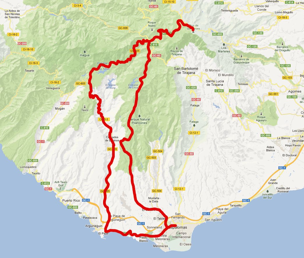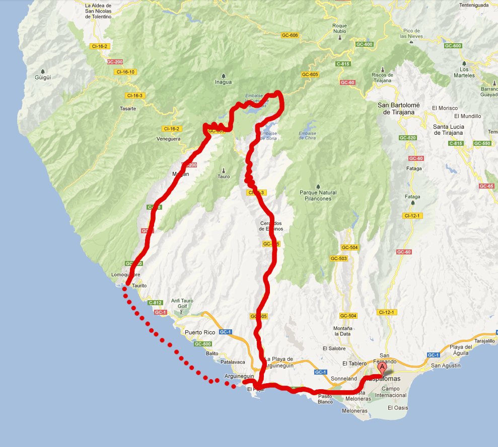 The way back follows the way we came for about 30 minutes. Then after Ayacata we take the other direction and cycle down to the Embalse de Chiara. From there we continue on a mountainbike trail. There is a bit of a way up on gravel but then we can enjoy the downhill ride. At about 5pm we leave the mountainbike trail and continue on road GC-604. After another hour of almost only downhill riding we arrive at 6pm - just in time - back at our hotel in Maspalomas. That was a great day and a really worthwhile cycling trip! 🙂