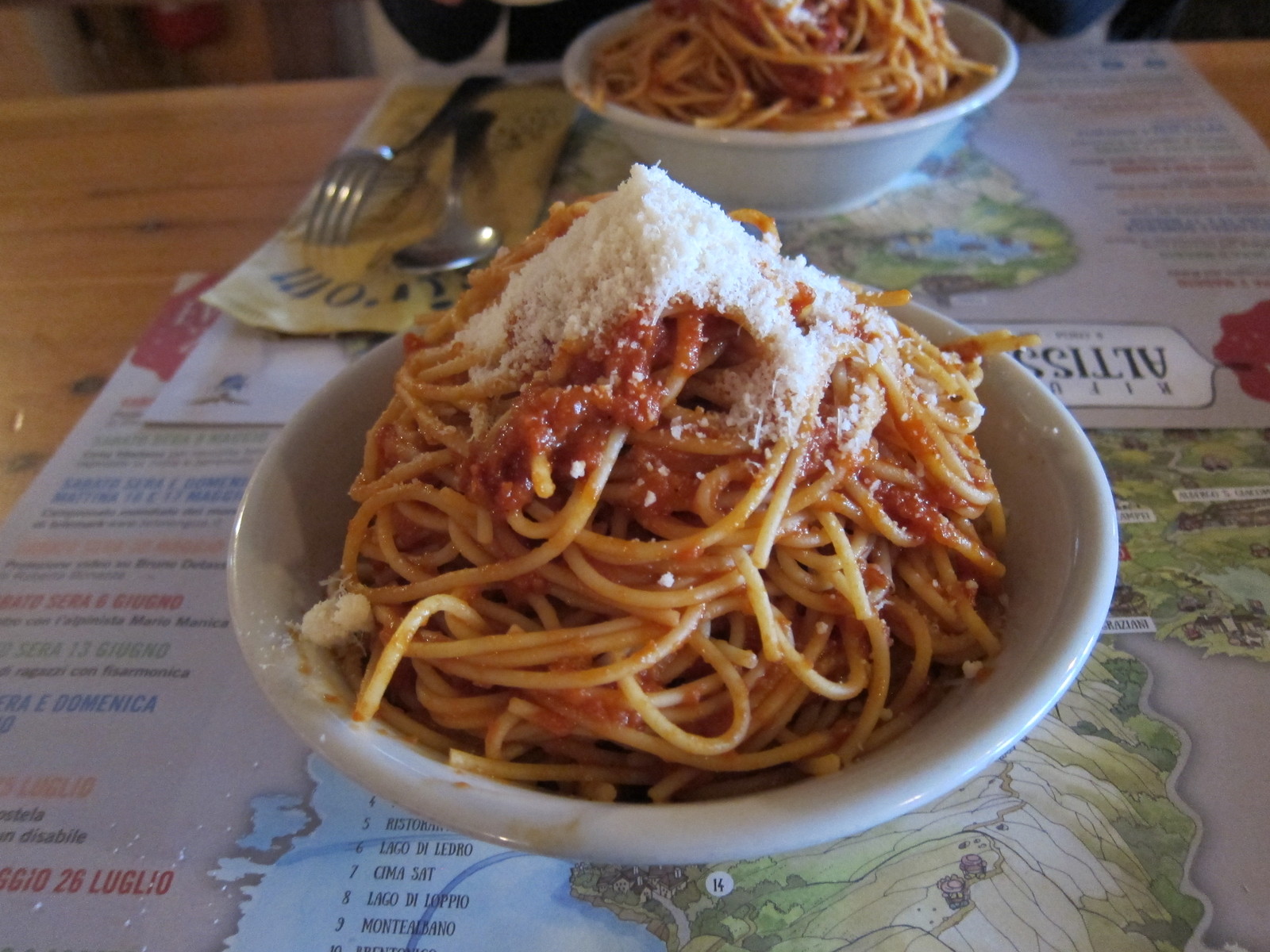 For the next two days we planned to cycle up to Monte Altissimo, sleep in the Rifugio there and cycle down the next morning. From Torbole we cycled up a paved road that begins at the Panorama parking place above the city. This road leads in many turns up to another parking space at 1500m. Even if this is a paved road almost no cars drive on this road. At about 1000m there is fresh water where you can refill the bottle. At 1500m the paved road ends and a gravel road begins for the next 300m. In the end you follow the hiking path 601 from where we had to carry the bike up to the top of Monte Altissimo. The view from top is really great. The Rifugio Altissimo is at 2060m, so you can look down 2000m and see the lake! When the weather is good you can also see the mountains from Brenta and Adamello. Because of the view it is really worth going up there. Half pension at the Rifugio is 39 Euro per person. The pasta in the evening was really good. Unfortunately the water pipe was broken when we arrived and there was no water to wash ourselves or flush the toilet. Anyway, mountain huts are always good for suprises 😛 So we shared the room with three Italian boys and after breakfast the next morning we biked back down again. First 200m we had to carry the bike down. But according to the Internet there are some good mountainbikers who can bike this down! I will definitely never do this. Shortly after arriving in Torbole it started to rain and we took the next bus and train back home.